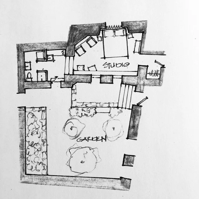 The Atelier has a queen sized bed, a sitting area at the fireplace, and dining at the counter overlooking the garden. There is an entry closet and good storage. Along the wall, facing the garden, is a long counter shelf which doubles for work space and eating. There is high-speed internet connection.